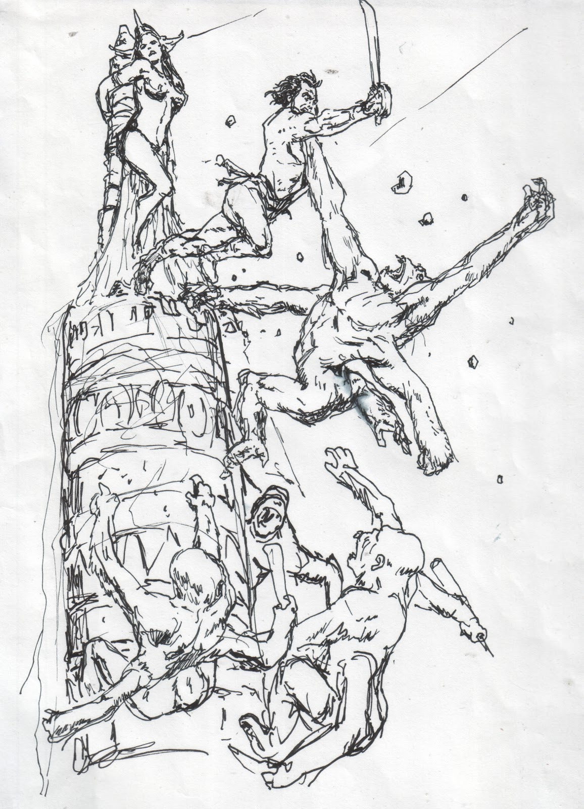 height as a danger element. It also brought Carter and the apes closer together in the composition. As I started in with the inking I was having a lot of fun. I got more into the rendering of the forms and playing around with the feathering ( especially on the main ape ). It kind of brought me back to my youth when my art was a bit more about that ( that is, rendering the volume of muscles and folds ) than about an overall scheme when it came to the lighting. I do admit it was fun getting lost in noodling and doodling.